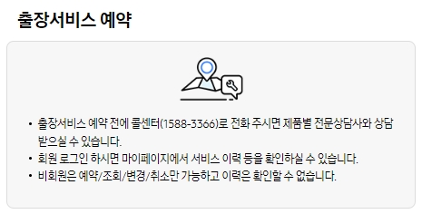 다음은 출장서비스 예약안내를 보겠습니다. 예약을 하기전에 콜센터로 전화하시면 제품별 전문상담사와 상담을 받을 수 있습니다. 회원으로 로그인 하시면 마이페이지에서 서비스 이력 등을 확인할 수 있으며, 비회원은 예약/조회/변경/취소만 가능하고 이력확인은 불가합니다.