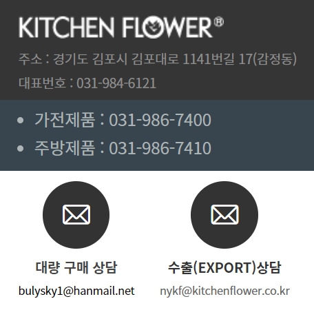 대표번호는 031-984-6121번, 가전제품은 031-986-7400번, 주방제품은 031-986-7410번입니다. 대량구매상담 및 수출상담을 위한 이메일주소도 안내되어 있으니, 위의 그림을 참고하시기 바랍니다.