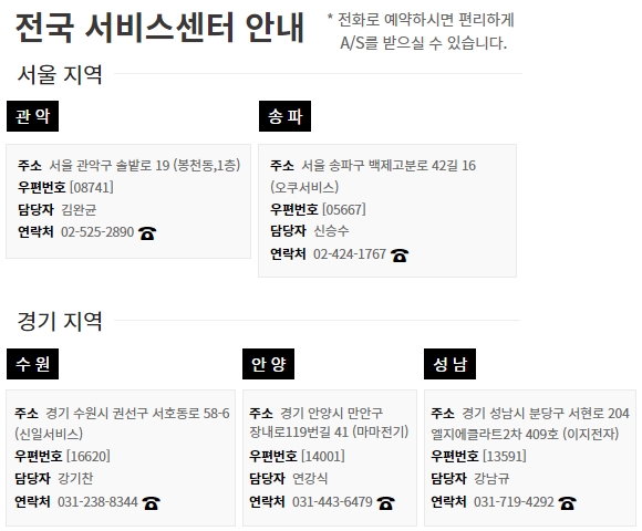 다음은 전국 서비스센터 안내를 보겠습니다. 전화로 예약하시면 편리하게 A/S를 받을 수 있다고 하네요. 서울지역부터 보시면 관악점과 송파 오쿠서비스가 있습니다.