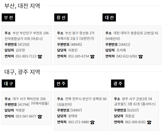 부산과 대전지역에는 부전 아로나, 창선 상원전기, 대전 비래전자가 있습니다. 대구와 광주지역에는 대구 미래사람들, 전주 성음전자, 광주 홈서비스가 있습니다. 각 센터에 대한 주소, 우편번호, 담당자, 연락처 정보를 확인해보시기 바랍니다.