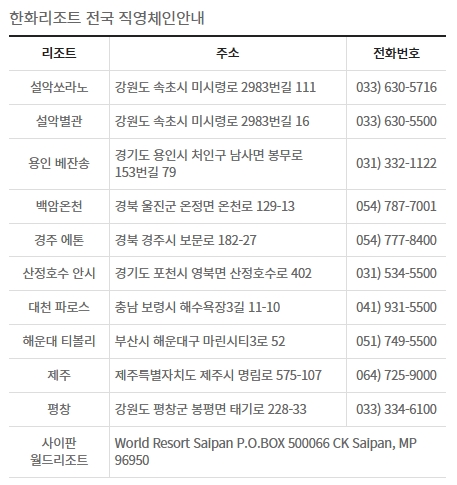 한화리조트 전국 직영체인에 대한 주소와 전화번호는 위의 표를 참고하세요. 비성수기의 기준은 일요일부터 목요일까지이며, 제주도는 일요일도 제외입니다. 멤버십 혜택으로 예약하면 디럭스룸 이용이 가능하고, 해운대의 경우 패밀리룸 및 평창의 경우 스위트룸입니다.