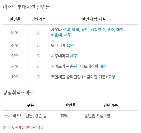 다음은 리조트 부대시설 할인율을 보겠습니다. 인원기준은 5인이고 설악, 백암, 용인, 산정호수, 경주, 대천, 해운대, 제주 리조트에서 사우나 이용시 50% 할인혜택이 있습니다. 또한 설악 워터피아와 제주 제주테라피는 40%, 춘천 제이드가든과 대천 머드테라피는 20%, 고양 로얄새들 승마클럽 초급마필 기준 10% 할인혜택이 있어요. 평창휘닉스파크에서는 동반인포함 4인기준으로 스키리프트와 렌탈 및 강습 등 30% 할인혜택이 있으며, 할인율은 투숙시에만 적용됩니다.