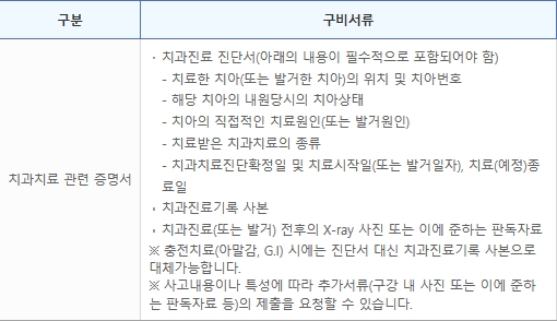 치과치료 관련 증명서로는 치과치료 진단서, 치과진료기록 사본, 치과진료 전후의 엑스레이 사진 또는 이에 준하는 판독자료가 있어야 합니다. 충전치료시에는 진단서 대신 치과진료기록 사본으로 대체할 수 있으며, 사고내용이나 특성에 따라서 추가서류 제출을 요청할 수 있습니다.