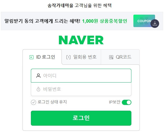 송작가네마을 고객을 위한 혜택으로, 알림받기 동의 고객에게 1천원 상품중복할인 쿠폰을 드립니다. 해당 쇼핑몰에서 상품을 구매하실 분들은 네이버 계정으로 로그인하여 알림받기 동의 후, 할인쿠폰을 받을 수 있어요.
