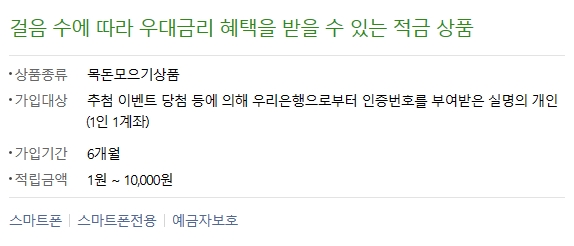 걸음수에 따라서 우대금리 혜택을 받을 수 있는 적금상품인데요, 우리은행 걷기적금 또는 데일리 워킹 적금은 추첨이벤트 당첨 등에 의해 우리은행으로부터 인증번호를 부여받은 실명의 개인(1인 1계좌)을 대상으로 합니다. 가입자 본인의 한도 내에서 비과세 종합저축으로도 가입이 가능합니다.