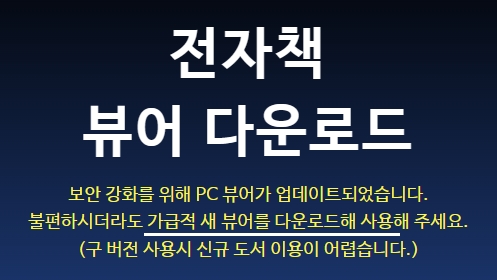 구버전 사용시 신규도서 이용이 어려우며, 보안강화를 위하여 PC뷰어가 업데이트 되어다고 하니 가급적이면 새 뷰어를 다운받아 사용할 것을 권장하고 있습니다.
