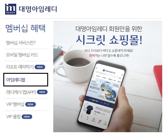 홈페이지 가입 회원도 동일한 아이디와 비밀번호로 이용할 수 있으며, 아임레디몰 가입일 및 접속일 기준으로 5천원 할인쿠폰과 웰컴 1천원 구매 쿠폰이 지급됩니다.